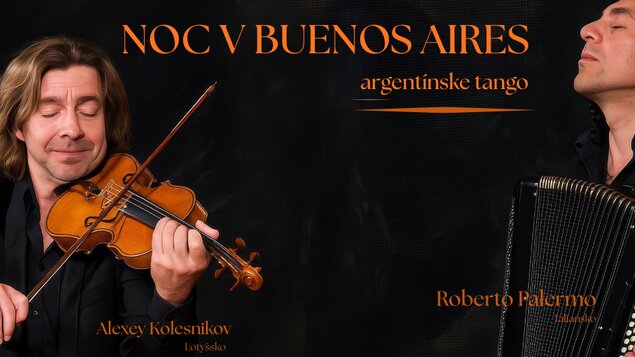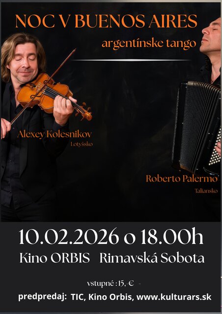 V utorok, 10. 2. 2026 o 18.00 hod. V Kine Orbis nám huslista Alexey Kolesnikov (Lotyšsko) a akordeonista Roberto Palermo (Taliansko) predstavia program venovaný argentínskemu tangu – umeniu, ktoré existuje na hranici medzi tradíciou a slobodou, medzi hudbou a pohybom. Jednoducho NOC V BUENOS AIRES. Predaj v TIC, Kine ORBIS a online.