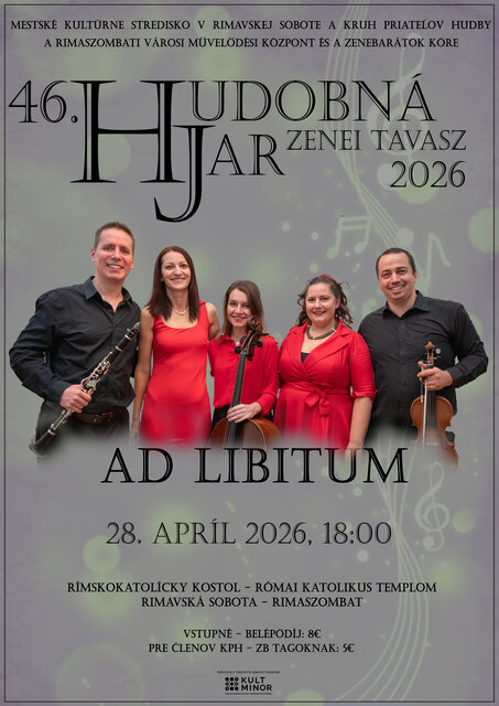 V utorok 28. apríla o 18:00 hod. otvoríme Hudobnú jar v Rimavskej Sobote vystúpením slovensko-maďarského kvinteta AD LIBITUM. V programe odznejú skladby T.Albinoniho, J.S.Mayera, F.Chopina, Z.Kodálya, B.Bartóka, J.Nomülnera, C. Debussyho, Ľ.Bernátha a M.Redmana.